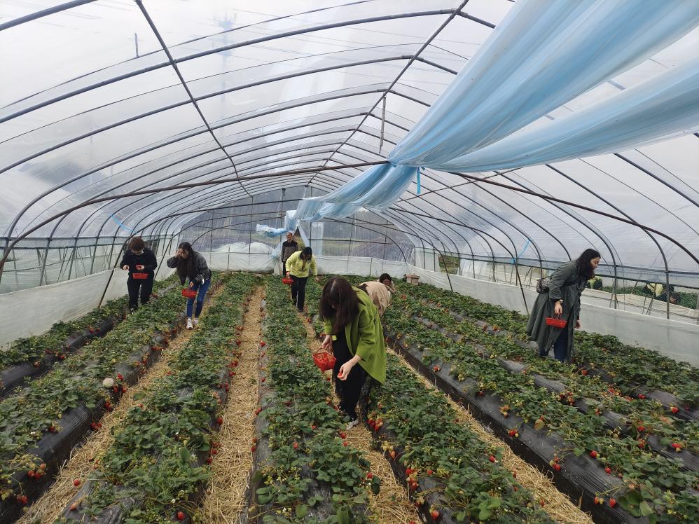 走进草莓种植大棚,一垄垄草莓长势喜人,嫩绿的草莓秧沿着田垄铺开,朵朵小白花点缀其中,绿叶下一颗颗饱满的草莓若隐若现,娇艳诱人,在空气中散发着淡淡的清香。女教工们在草莓园中体验采摘的乐趣,大家一边向农家请教草莓的品种以及草莓甜度的识别,一边也感受到春日生活的美好。