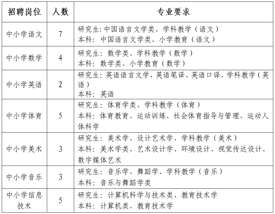 研究生及以上学历毕业生或全日制普通高校师范类专业本科毕业生,其中体育、美术、音乐、信息技术岗位放宽到非师范类专业;年龄在30周岁及以内(1992年5月23日以后出生)。