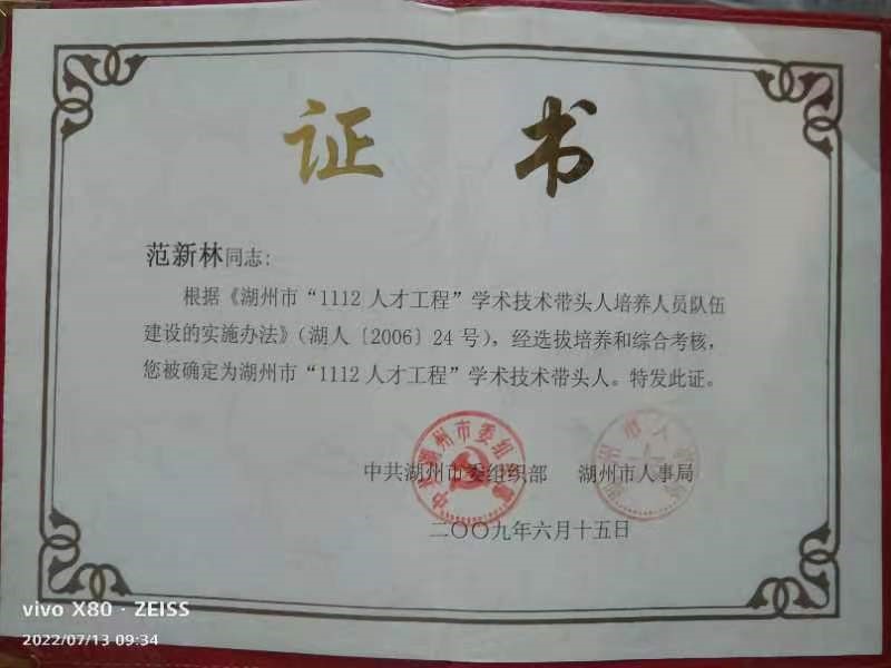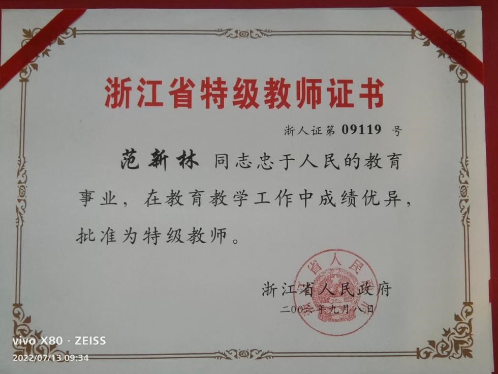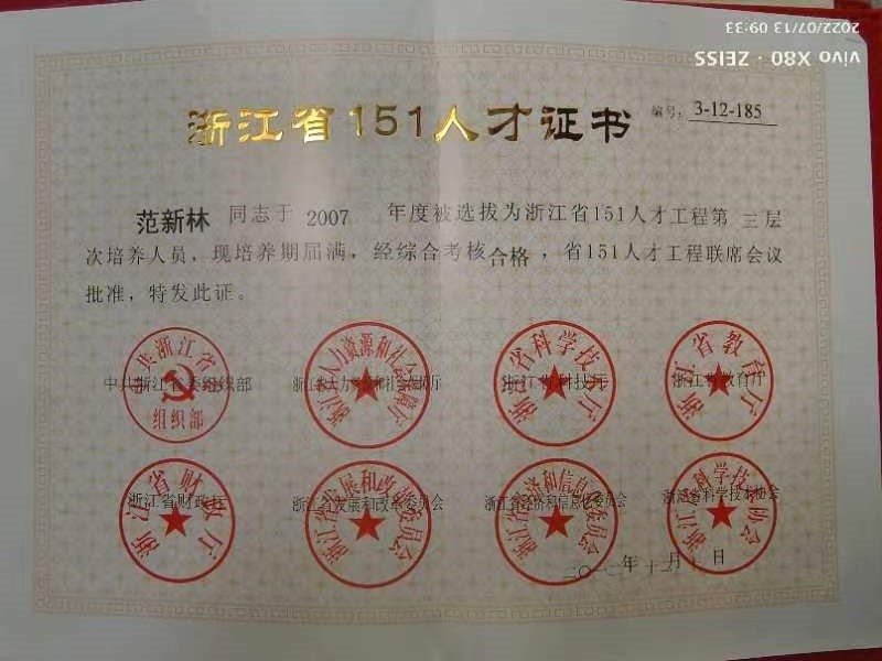 范新林的荣誉证书
