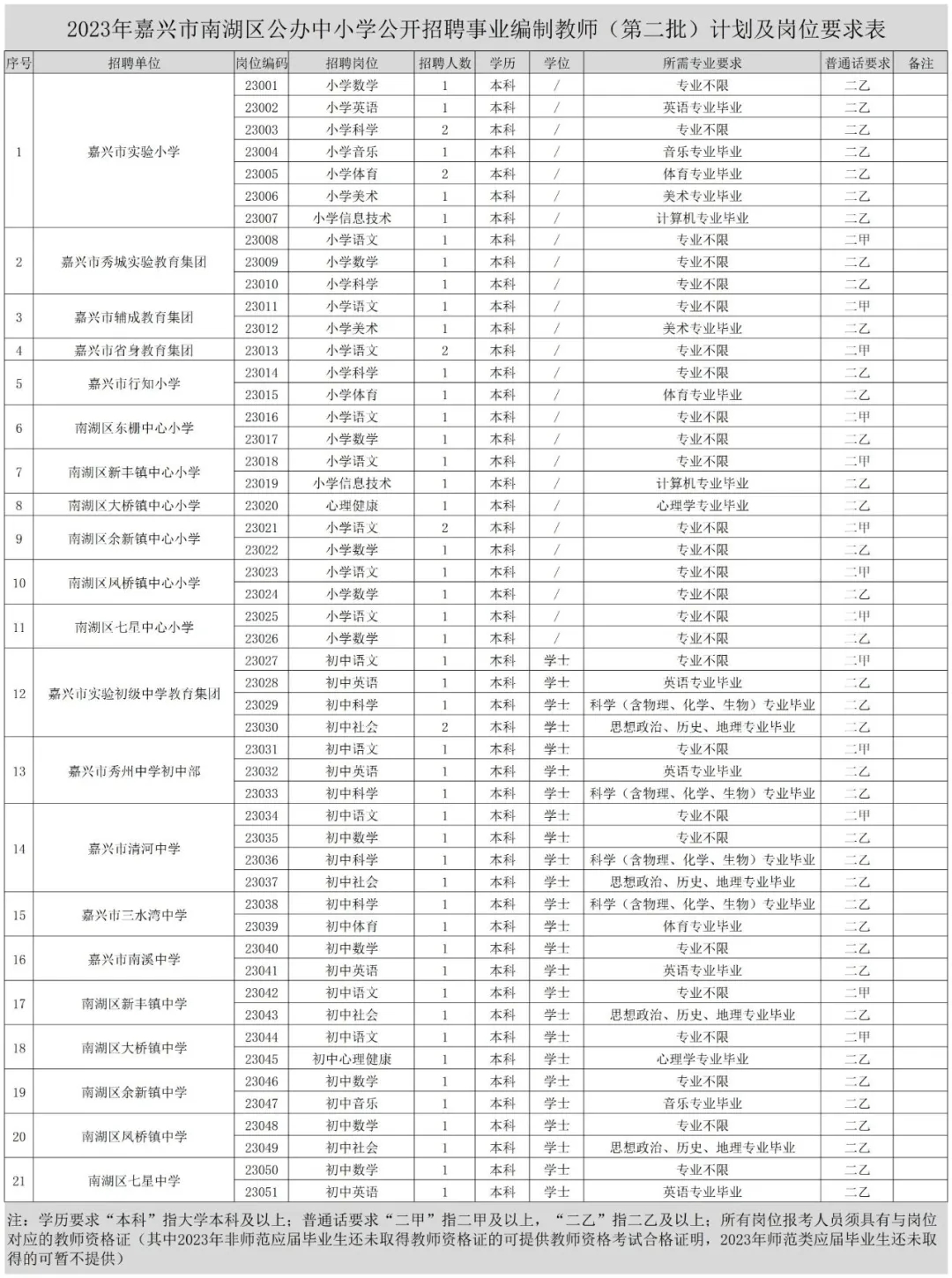 本次嘉兴市南湖区计划招聘事业编制教师56名。具体招聘学校、岗位、人数和资格条件等详见《2023年嘉兴市南湖区公办中小学公开招聘事业编制教师(第二批)计划及岗位要求表》(以下简称《计划及岗位要求表》)。