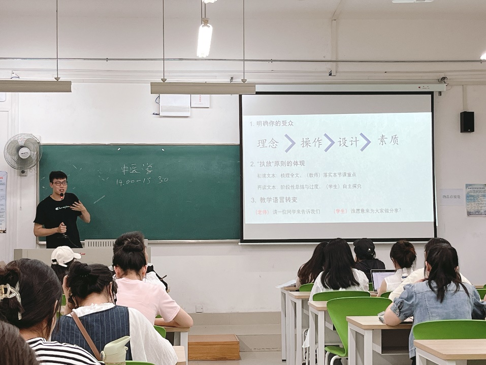 诸洪程学长根据大赛不同流程所涉及的基本特征,分别对赛前准备和赛时表现做了详细介绍。对于赛前的准备部分,诸洪程学长提议要基于自身的情况向导师或身边的参加过“田家炳杯”的老师讨教经验,并且要合理利用有效资源,应在板书设计、教学设计、课件制作和模拟练习等方面下足功夫。学长认为写教案时要注重书写的规范性、整体性,并且要体现学科前沿性和价值性,并提醒大家要做好模拟说课的训练,保证在赛前做好充足的准备。