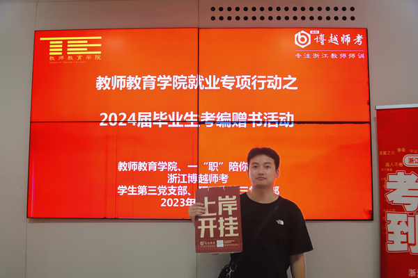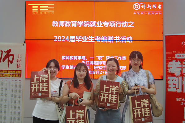 为深入践行“就业优先”战略,提升毕业生笔试面试竞争力,9月26日下午,由教师教育学院、一“职”陪你工作室主办,学生第三党支部、研究生第三党支部承办,浙江博越师考赞助的就业专项行动——2024届毕业生考编赠书活动在教师教育学院一楼大厅举行。