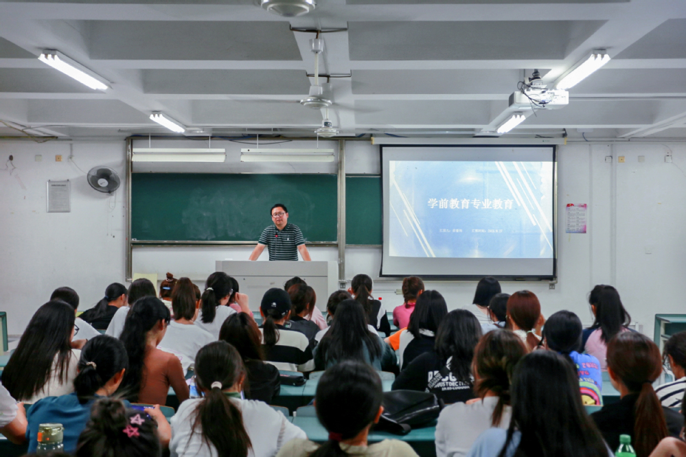 在学前教育学系2023级新生专业教育中,系支部书记俞睿玮老师主持了讲座,并邀请2017级学前专业的江志航作为演讲嘉宾。江志航同学分享了自己的求学经历,并提出了勤学笃行、知行合一、保持良好的阅读习惯等三点建议。曹珂轶同学介绍了小荷综艺团的基本情况和社团活动。俞睿玮老师详细讲解了学前教育专业的发展历程、课程内容、培养方案等情况,并强调了知行合一的重要性。