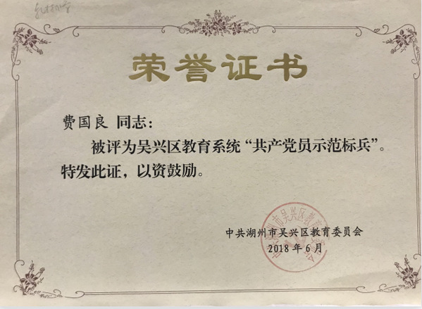 “学高为师,身正为范”是我国著名教育学家陶行知对所有教师的期望,也是湖州师范对师范学子的激励。费国良认为教师不仅要具备渊博的知识和浓厚的文化底蕴,还要具备高尚的道德情操。“要给学生一杯水,自己必须先有一桶水。”在大学期间,费国良脚踏实地,勤练基本功和专业技能,不断提高自己的综合素质。在大学校训的指引下,费国良学到了为人正直,在平时更是严于律己,以身作则。费国良说:“习总书记说的一句话就是‘立德树人’,这也是我一直以来秉持的原则——先做人,再做事。”育人先修身,费国良以高标准要求自己,躬身实践,为成为一名有扎实学识,有高尚道德情操的教师而努力。