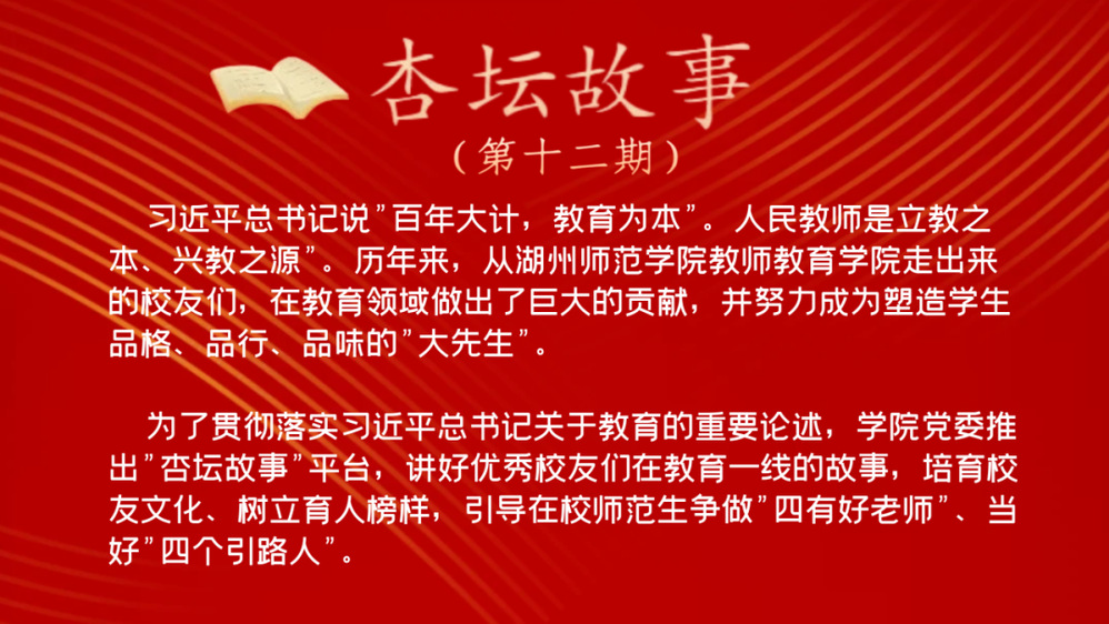 1993年,费国良从湖州师范毕业。那个在机缘巧合之下走进湖州师范的懵懂少年费国良,扛起杏坛大旗,心怀母校“学高为师,身正为范”的校训,踏上了从教之路。
