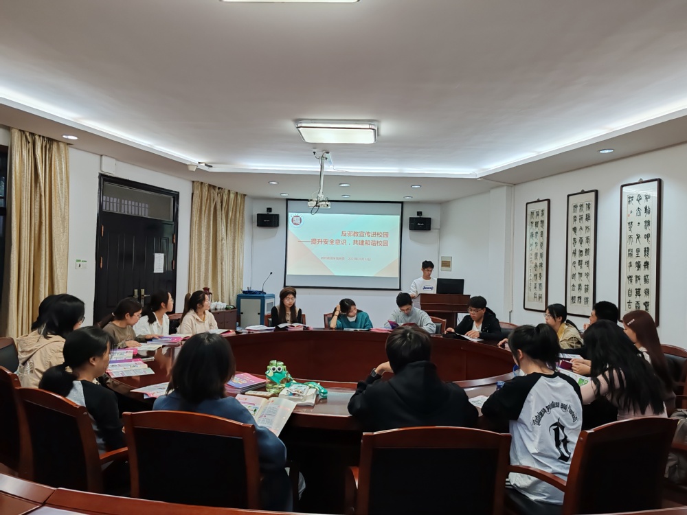 为提高同学对邪教的防范意识和法制观念,10月23日下午,我院在10-111召开了一次校园反邪教宣传会议。会议由2023级新生辅导员主持,2023级各班班长、团支书等主要班委参加。