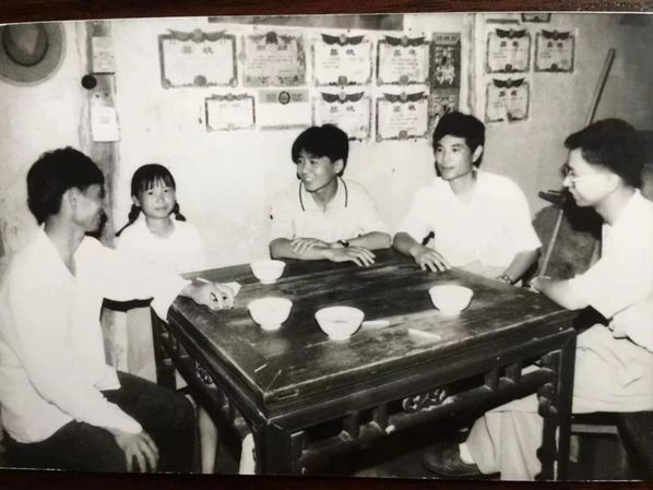 1996年黄玉平刚参加工作时到学生家中家访(图中者)