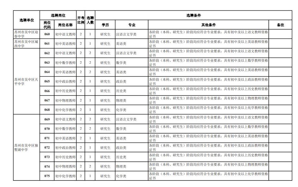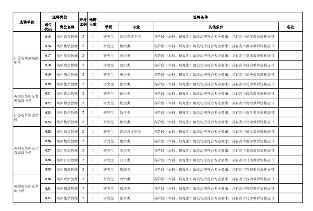 各岗位开考比例详见《苏州市吴中区教育局选聘2024届优秀毕业生岗位简介表》(附件)。报名结束后,未达到开考比例的,将核减或取消该选聘岗位。通过“吴中教育热线”网站(http://www.wxedu.net/)发布有关信息。
