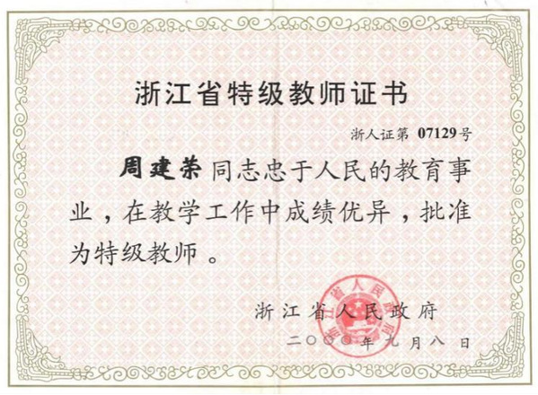“宠辱不惊,胜似闲庭信步”这句话恰合具备专业自信的周建荣老师。1986年8月转到重兆乡中心小学任教,任教数学、科学、体育、美术等众多学科,协助教导处工作,锤炼了教育教学的各项能力。1994年7月调入镇西小学,第二年转到到双林镇庆同小学,在小学一二年级体育锻炼标准、小学数学竞赛等方面展开研究,取得突破性的成绩,和体育组合作的一二年级体育锻炼标准的论文被推荐到当时的国家教委和国家体育总局,数学竞赛取得的成绩足以让许多数学教师敬佩。1999年8月,他调入南浔实验小学,那时他正在申报特级教师,湖州市特级教师评审委员会的专家在1999年12月25日来考察他上的体育课。寒风飒飒是室内都难以抵挡的冷,更别说是在户外开展的体育课了。然而,他面对这样的困难,没有退缩,也没有失误,照常出色地完成了这一堂条件恶劣的考察课,最终“瓜熟蒂落”,顺利评上特级教师。在采访中周建荣提及此事时,脸上浮现出从容不迫的笑容,相信在面对恶劣天气坚持上好体育课的时候,在评选特级教师结果出来的时候,他也是这样的从容、不迫。这源于他对自身能力的自信,以及对自身专业素养的高度认可。内心有想法,工作有信心,更拥有向上看,向上奋进,向上发展的动力和学习力,才造就了周建荣这样的专业自信,也帮助他在这条教育之路上走得更远、走得更好。