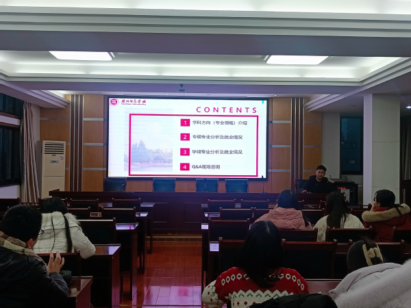 讲座伊始,由学院负责就业老师介绍学院现有硕士研究生学科方向和专业领域情况,讲述不同专业的就业方向及侧重点,引导学生规划未来就业航向。