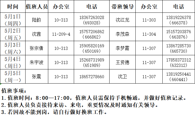 教育学院(教师教育学院)2025年五一值班安排表 (5月1日-5月5日)