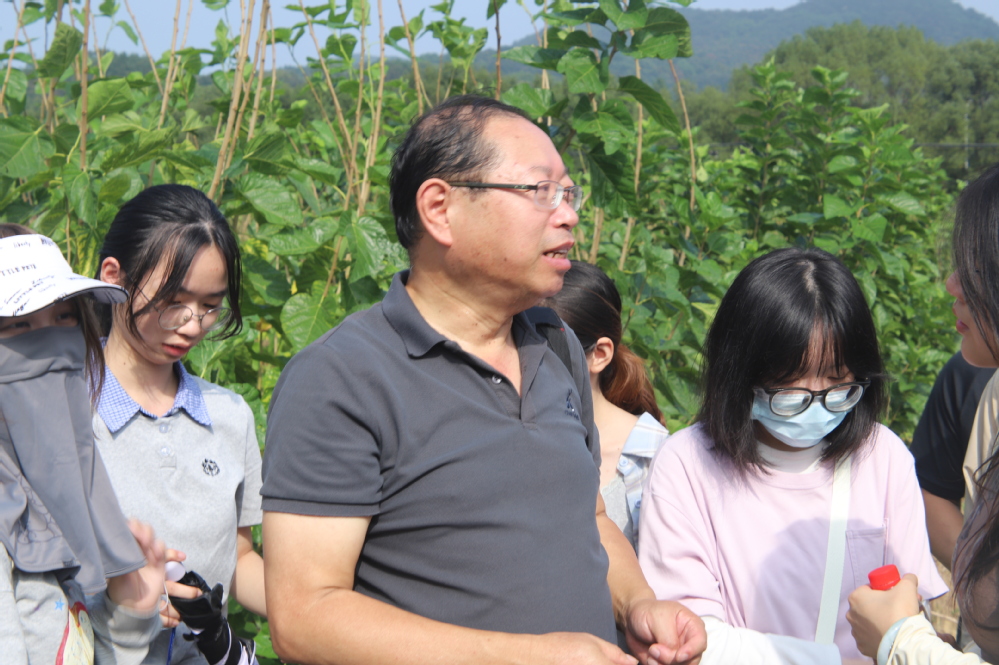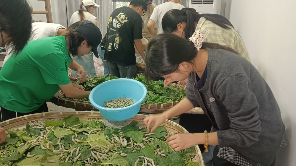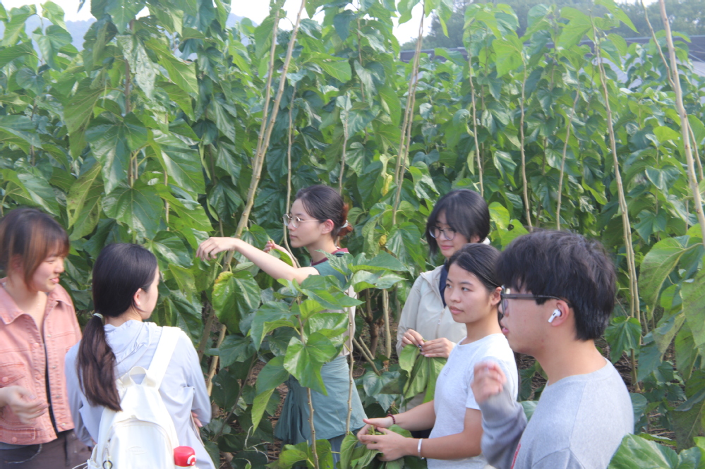 课程初始,在余连祥、沈依帆以及李书祎老师的带领下,同学们踏入桑园。余老师详细讲解了桑叶采摘的知识与技巧,从桑叶的成熟度判断,到采摘时对桑树的保护,都耐心说明。随后同学们分批次来到桑园,在余老师的指导下,逐渐熟练掌握采摘方法。