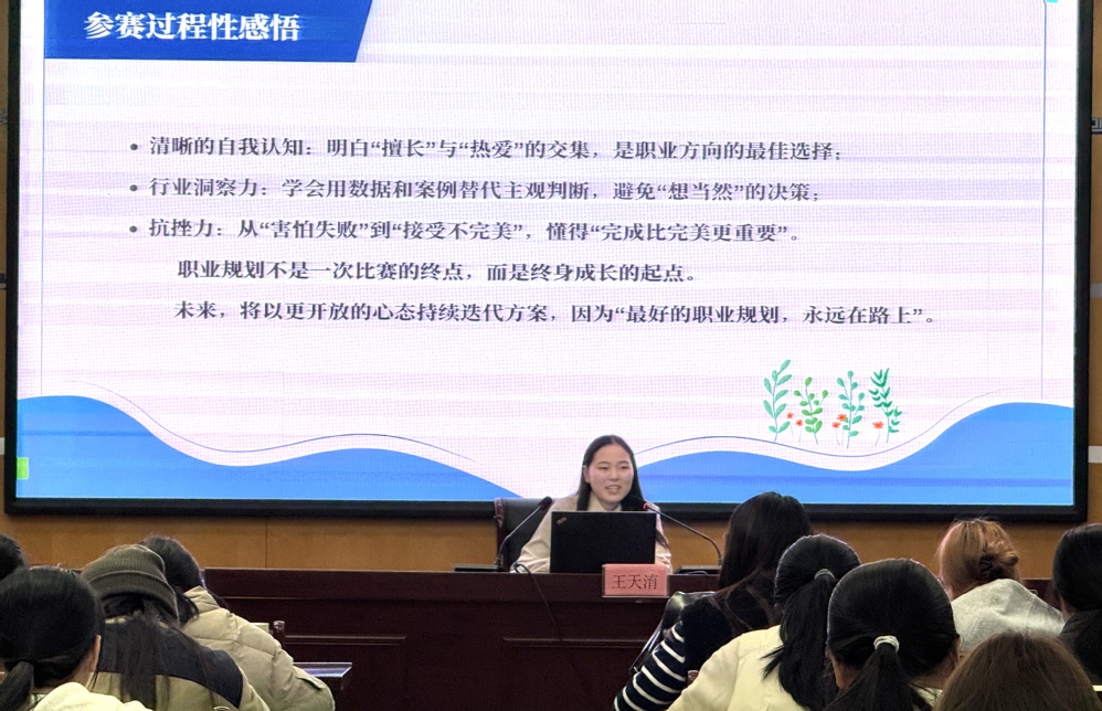 活动中,赛事负责学生干部黄赛琼详细介绍了大赛参赛要求、逻辑规划书模版及制作步骤,为同学们参赛筑牢基础。第十七届职业规划大赛校赛特等奖学生史李想分享了成长赛道备赛经验,她强调需先完成生涯规划报告,再在此基础上制作PPT,清晰的逻辑与扎实的文本是作品出彩的关键。校赛一等奖学生王天淯则聚焦PPT呈现技巧,从作品设计巧思、备赛时间规划到参赛心路感悟,全方位展现就业赛道备赛要点。