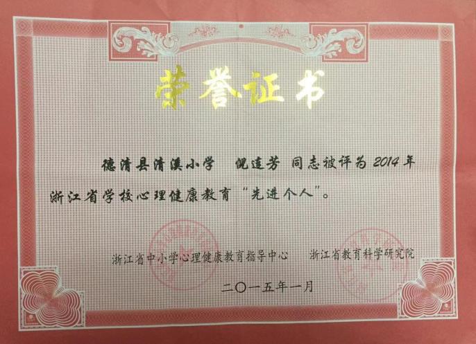 倪连芳被评为“浙江省学校心理健康教育‘先进个人’”