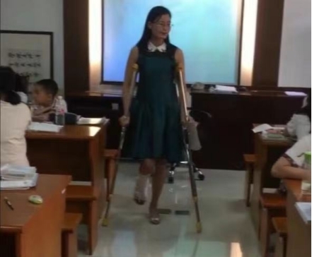 倪连芳拄着拐杖给学生上课