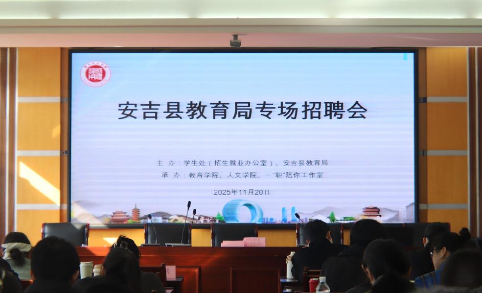 为深入贯彻落实“就业优先”战略,扎实推进2026届毕业生高质量就业工作,我院于11月20日在中校区10-512会议室成功举办安吉县教育局专场招聘会。招聘岗位涵盖中学语文、数学、英语、物理、化学、地理、历史等多个学科领域。学院党委书记沈江龙、党委副书记沈卫亲临现场指导工作,并与安吉县教育局相关负责人就人才招聘与培养等事宜进行深入交流洽谈。