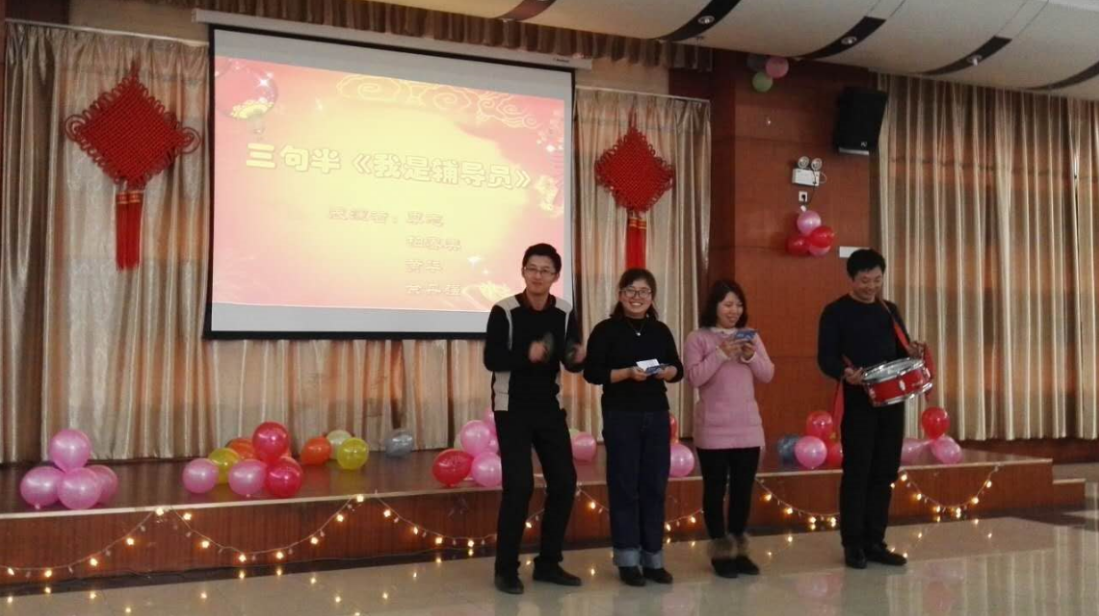 李彬院长代表学院领导班子向全体老师表示感谢,并送出了新年寄语。随后各系表演了精心准备的节目,姜祥君老师的一首《把一切献给党》,激情高昂,荡气回肠,唱出了一位共产党人的心声;顾佳黎老师的《当爱在靠近》优美柔情、使人沉醉;邵仙萍老师的一段《谁料皇榜中状元》也是婉转动听,让人神往;学工线老师的三句半《我是辅导员》展现了辅导员工作的辛苦与快乐;胡晓斌老师深情演唱的《吻别》更是把气氛带到了高潮,让人心潮澎湃。另外,茶话会中穿插的抽奖以及抢凳子、吸管接力、双人背夹气球、你演我猜等游戏更是让大家惊喜不断、笑声不断。