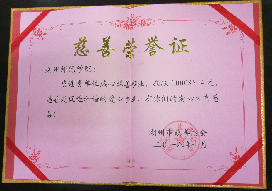 近日,湖州市慈善总会给我校颁发慈善荣誉证,以表彰我校在“慈善一日捐”活动中取得新成绩。