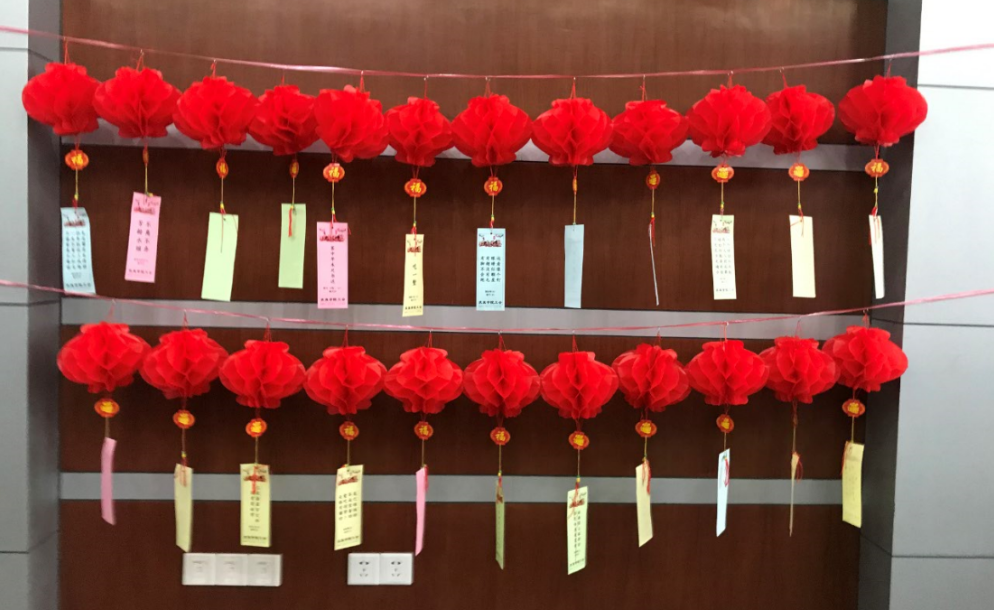 韩书记致辞结束后猜谜活动正式开始。大家互相讨论,并从装点的红灯笼上摘下自己猜出来的谜语。活动将持续三个下午,让大家都有机会参与。热闹的活动将大家聚在一起,让大家逐渐熟识,为增加学院教职工的凝聚力做出了贡献。