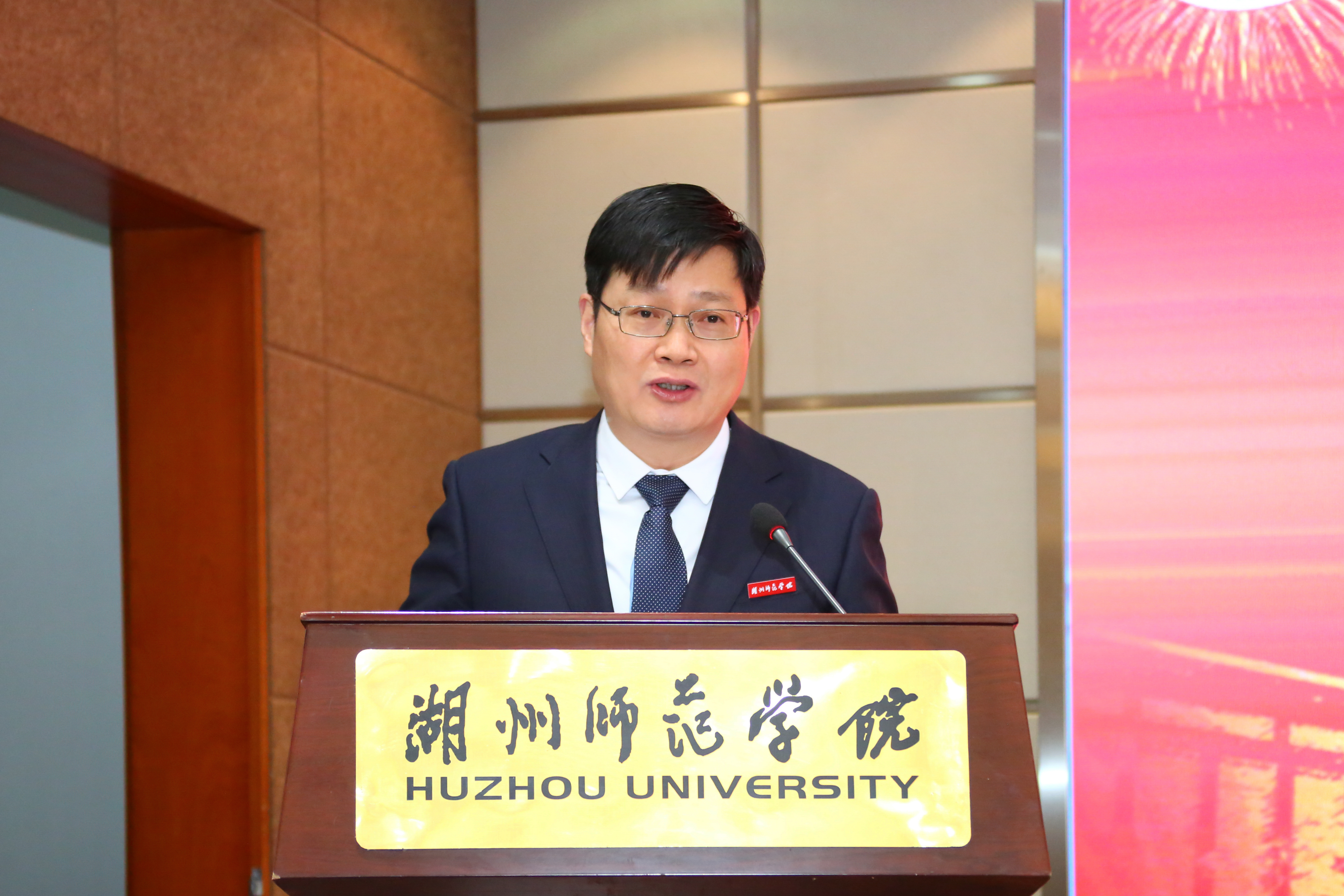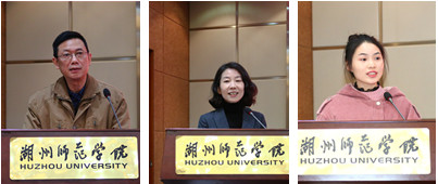 信息技术中心的潘建新老师作为荣休教师代表发言。他从83年留校工作至今,亲身经历了学校搬迁、学校合并、升格本科、获批硕士点、申报更名大学等大事,亲眼见证了学校从小到大、由弱到强的发展过程。他表示,作为湖州师院的一份子感到无比的荣幸与自豪。