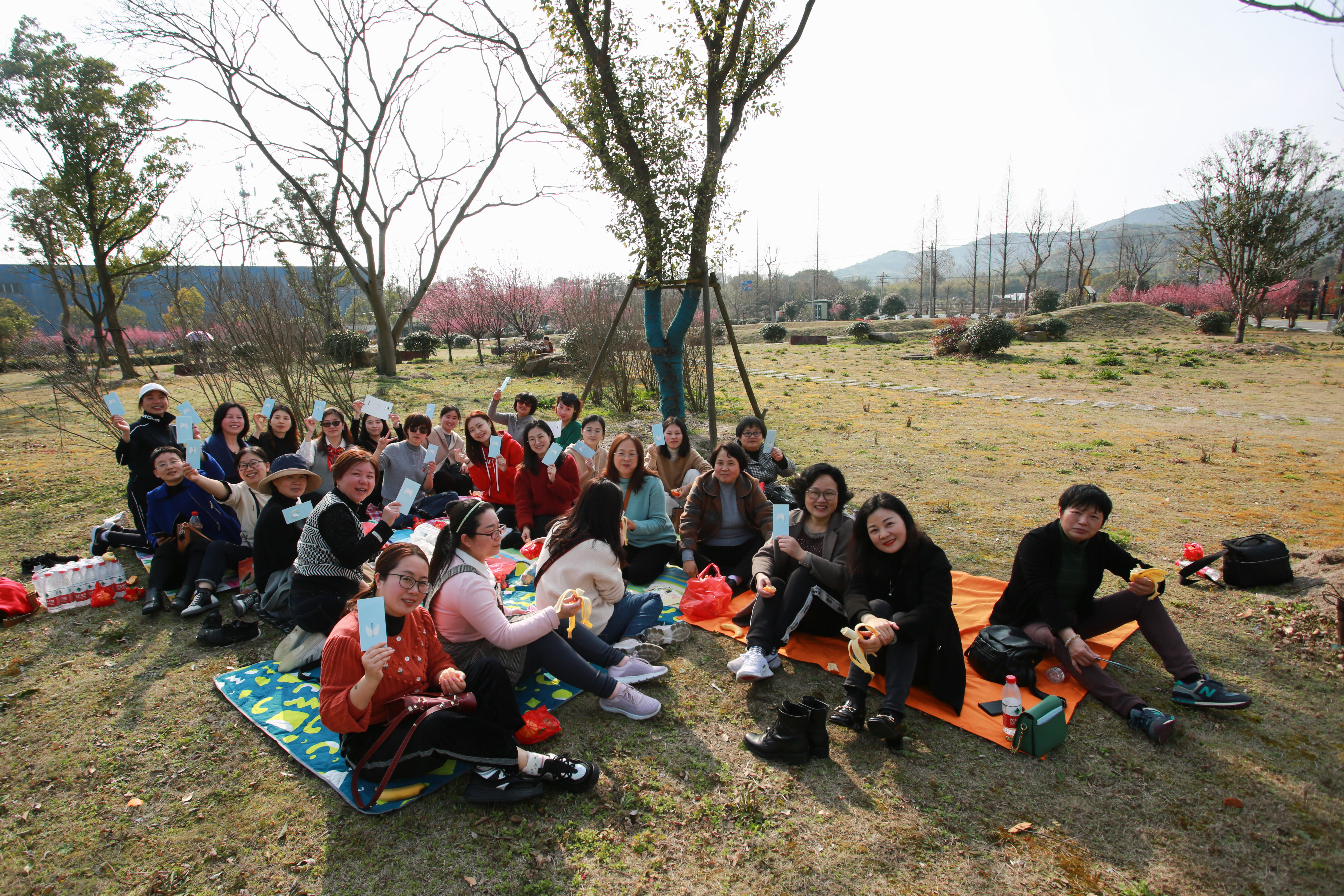 吴兴南郊菰城村,青山环抱,绿水长流,空气清新,环境静谧,不需要刻意寻找梅花踪影,浮动的暗香阵阵袭来,为健步者们引路。大家沿着石板横铺的古道快步向前,经过“知止亭”,再走一里,又见“止止亭”,一直行走到古梅花观。行走稍显疲乏后,在开阔的草坪上铺上五彩垫子,大家吃着瓜果点心,开心地聊天交流。在寻找春日的快乐之际,大家忙里偷闲,甚是惬意。通过活动,工会激励广大女教职工健康运动,快乐生活,以积极向上的精神状态投入到工作中。