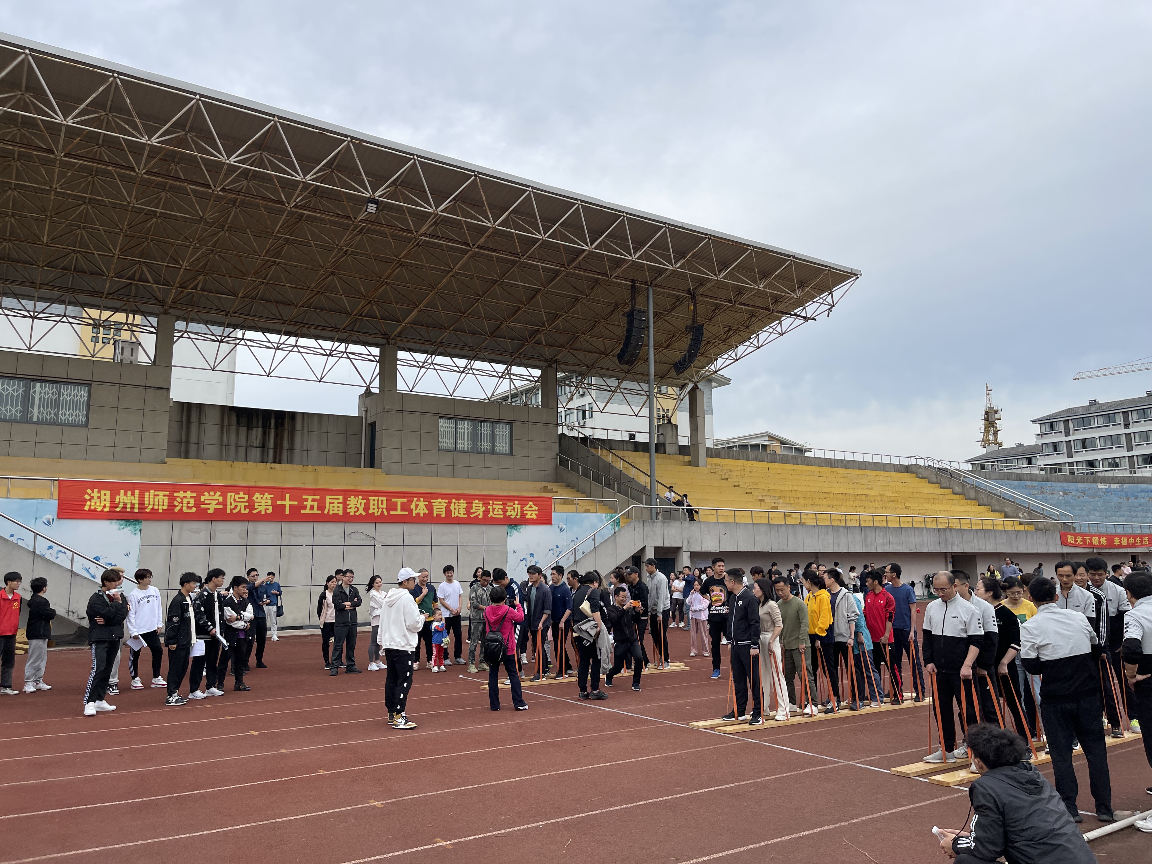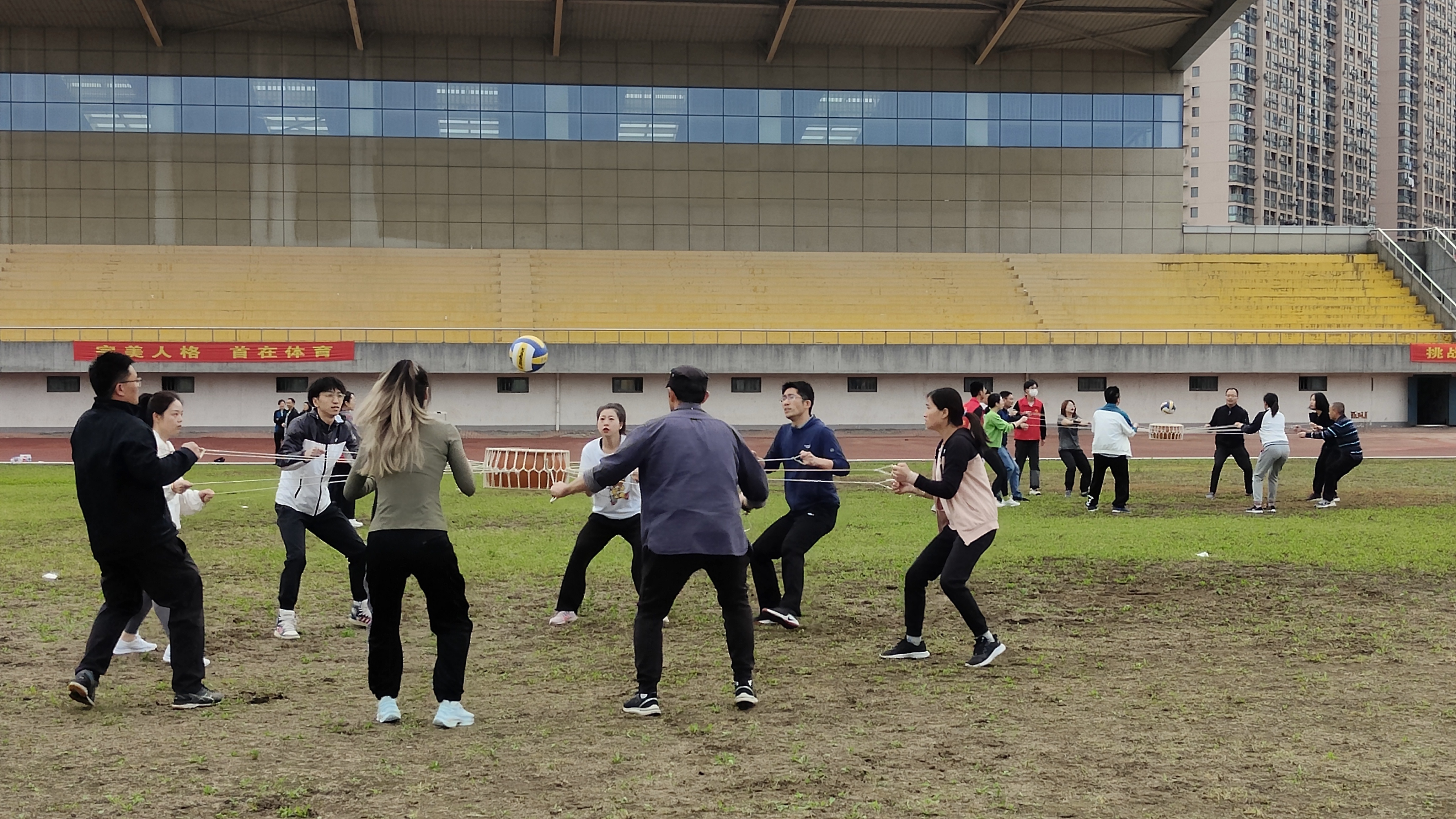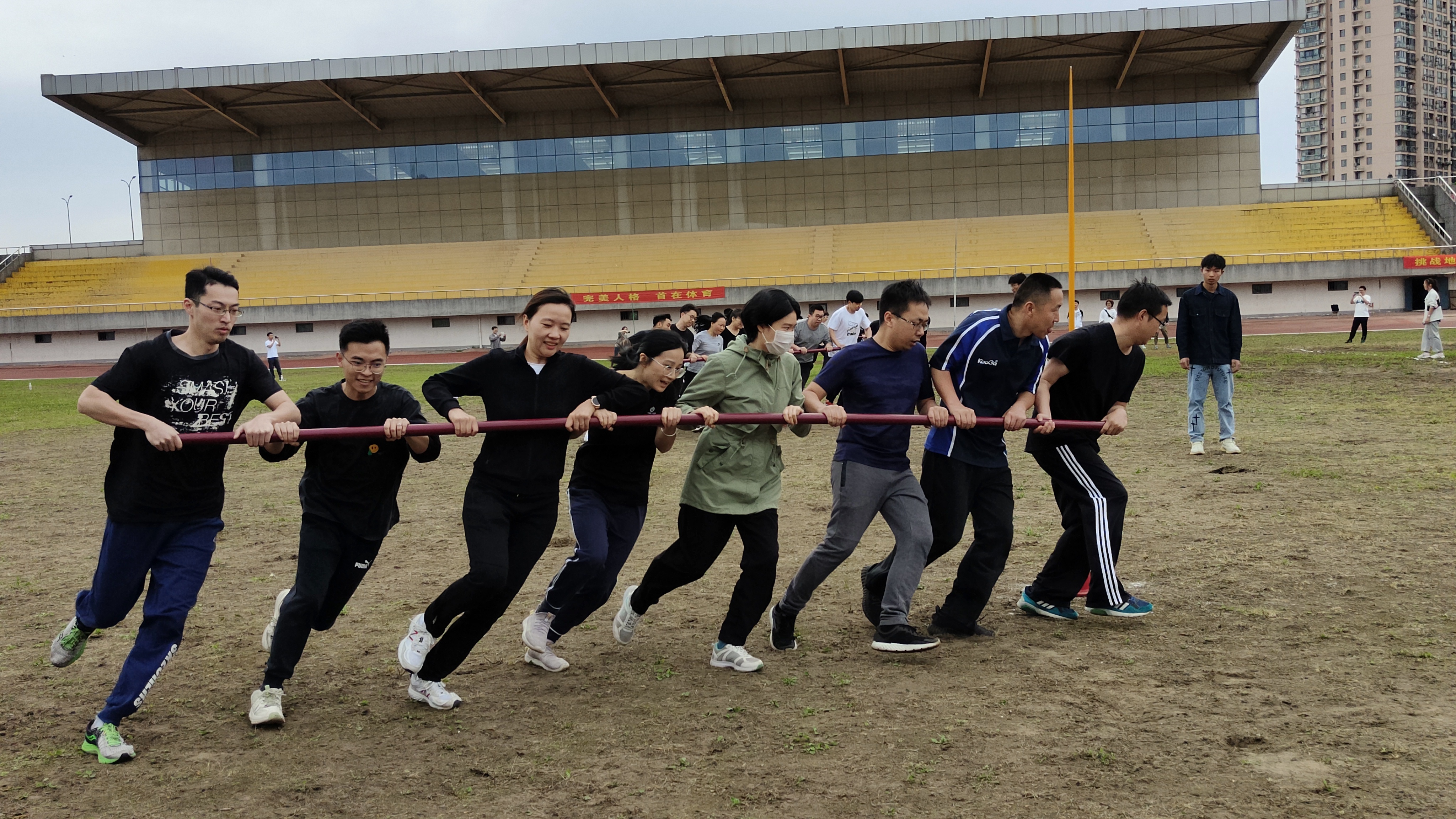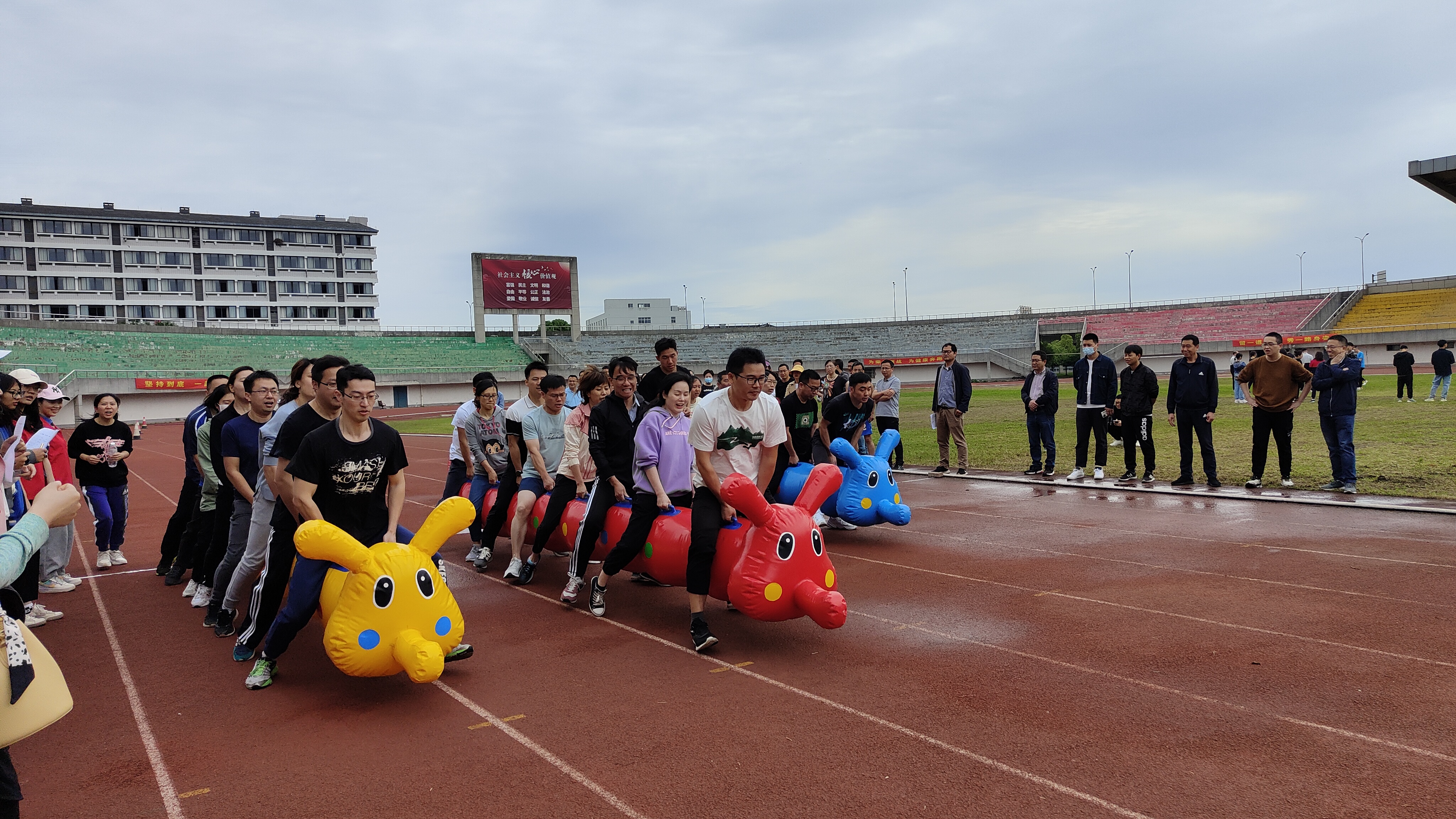 本次比赛旨在增强各分工会的凝聚力,激发团队的意志力,展现我校教职工蓬勃向上的朝气和凝心聚力的精神风貌,让大家在工作之余增进相互的交流和互动。运动会共设4个集体项目:同心鼓、毛毛虫、旋风跑、大脚板。今年运动会设置全新的集体性项目,对各参赛队员间配合的默契度要求很高,每个项目都需要8位运动员在赛前熟悉规则、讨论技巧。在比赛中,队友们只有齐心协力、步调一致,充分发挥团队的智慧和力量才能顺利完成任务。比赛充满了趣味性和挑战性,整个田径场到处洋溢着笑声和喝彩声。