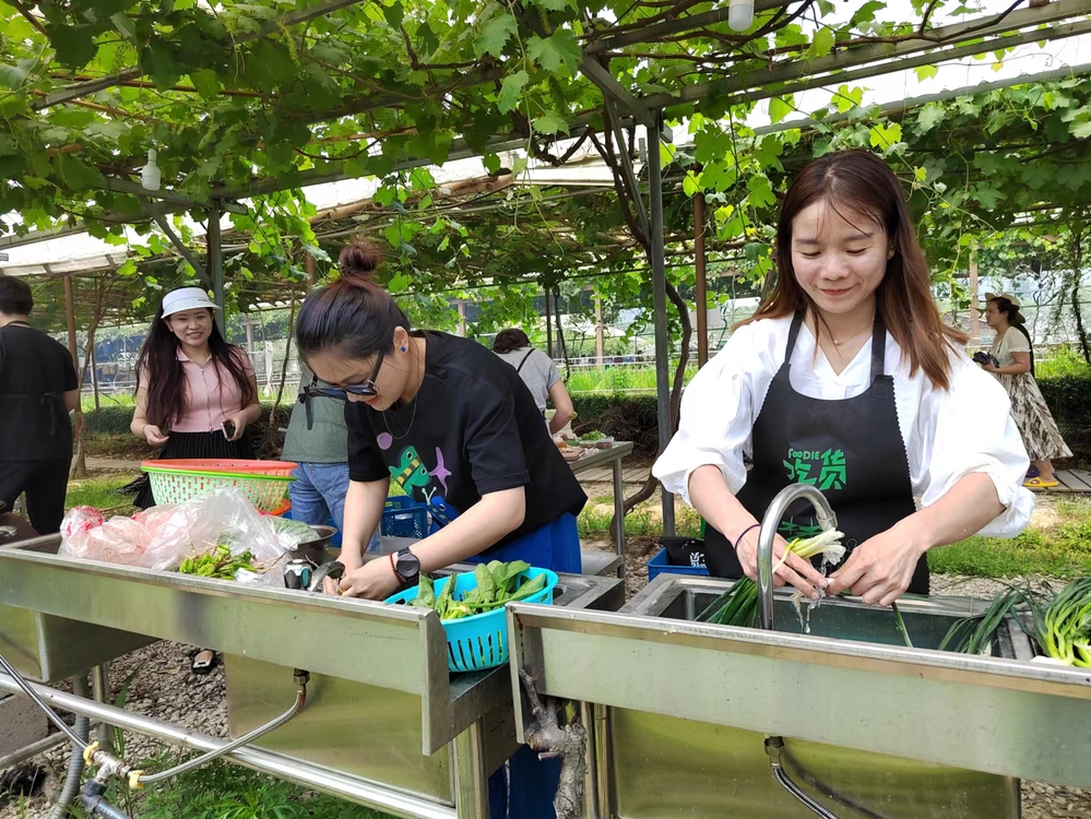 上午,大家来到了位于湖州道场乡红里山村的土蛋哥农庄,零距离感受田园风光,体验自己动手、丰衣足食的乐趣。农庄风景优美,为游客们预备了灶台、长桌、炊具和新鲜的食材。大家撸起袖子、穿起围裙,投入到愉快的备餐烹饪中。有的洗菜备菜,有的配菜烧菜,有的加柴生火……齐心协力制作了一顿丰盛的午餐,大快朵颐之际,相互分享开心事,场面热闹,气氛轻松愉悦,玩得不亦乐乎。最后大家合影留念,在相机里定格下这愉悦充实的瞬间。