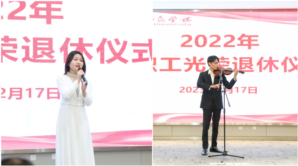 仪式开场,轻柔的音乐营造了温馨欢乐的气氛,屏幕滚动播放荣休教职工从教生涯中的难忘瞬间。动听的歌曲表达了师院对荣休教职工的感激之情。