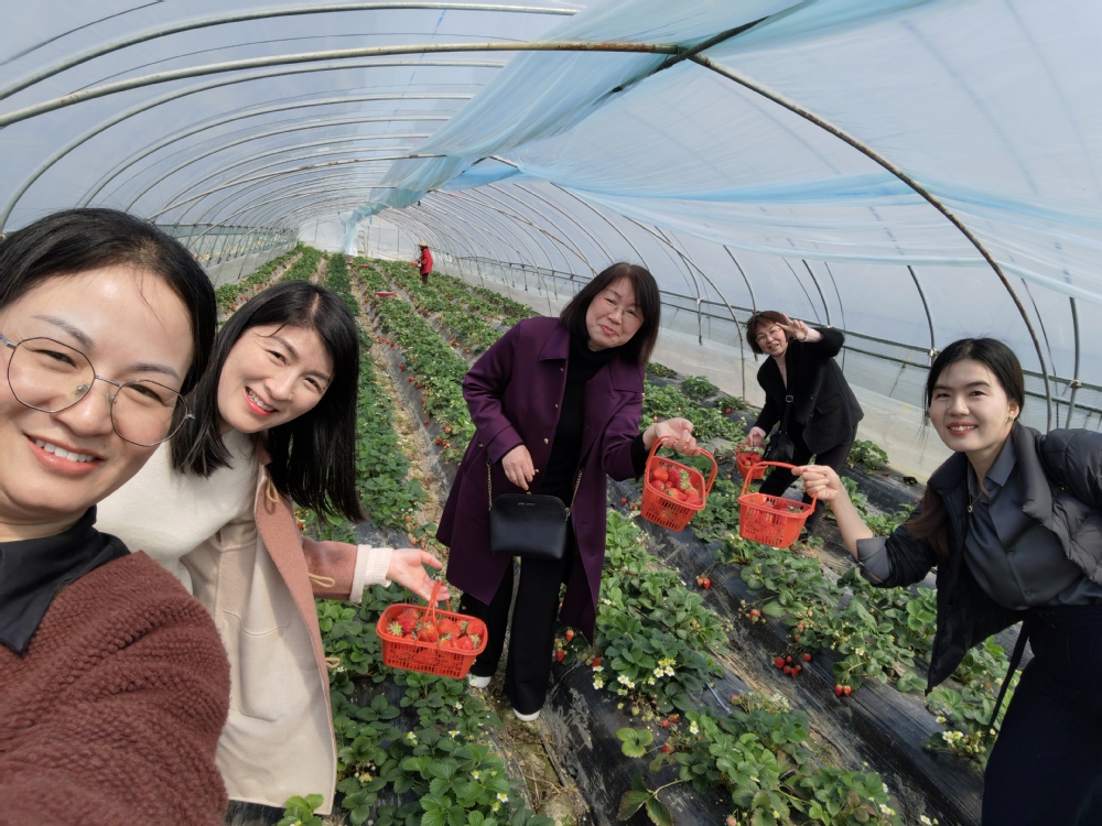 阳春三月,微风和煦,花红柳绿。在第114个国际“三八”妇女节来临之际,为体现学院对女老师们的关爱,13日生科院分工会组织学院女教工来到了位于长兴的虹燕家庭农场开展草莓采摘活动,学院蔡振春书记和分工会委员全程陪同。