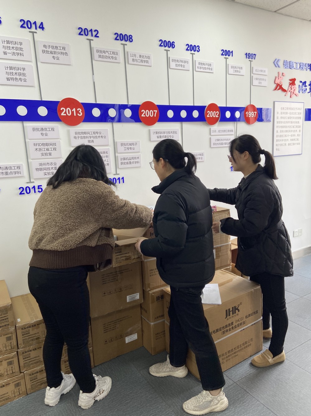 在“三八”国际妇女节即将到来之际,信息工程学院教师王胤以浙江行见医联科技有限责任公司名义,向全校女教职工捐赠800份乳酸抑菌洗液、红外额温计,500份早孕测试笔。