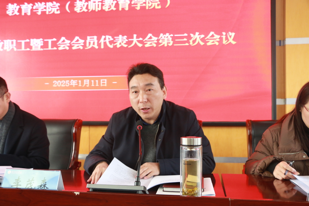 2025年1月11日,教育学院(教师教育学院)第六届教职工暨工会会员代表大会第三次会议在学院10-502会议室隆重召开。学院领导班子成员、双代会代表齐聚一堂,总结过去、展望未来,共商发展大计。会议由学院党委书记沈江龙同志主持。