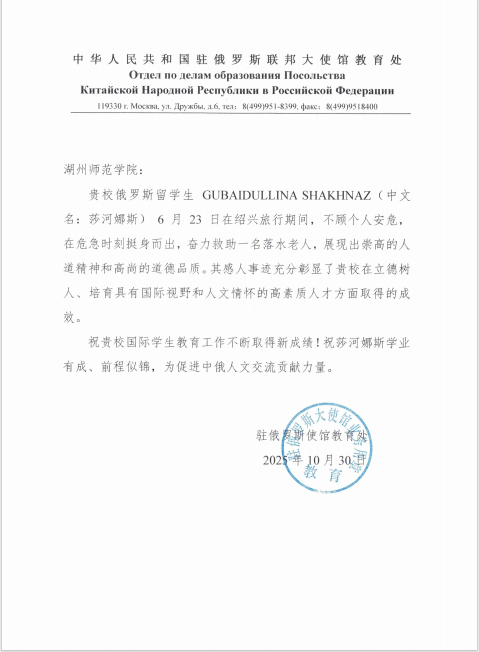 近日,中华人民共和国驻俄罗斯联邦大使馆教育处向我校致表扬信,表彰我校国际学生GUBAIDULLINA SHAKHNAZ(中文名莎河娜斯)6月23日在绍兴旅行期间,不顾个人安危,在危急时刻挺身而出,奋力救助落水老人事迹。中国驻俄大使馆教育处高度肯定我校国际学生教育管理工作,莎河娜斯的感人事迹充分彰显了我校在立德树人、培养具有国际视野和人文情怀的高素质人才方面取得的成效。