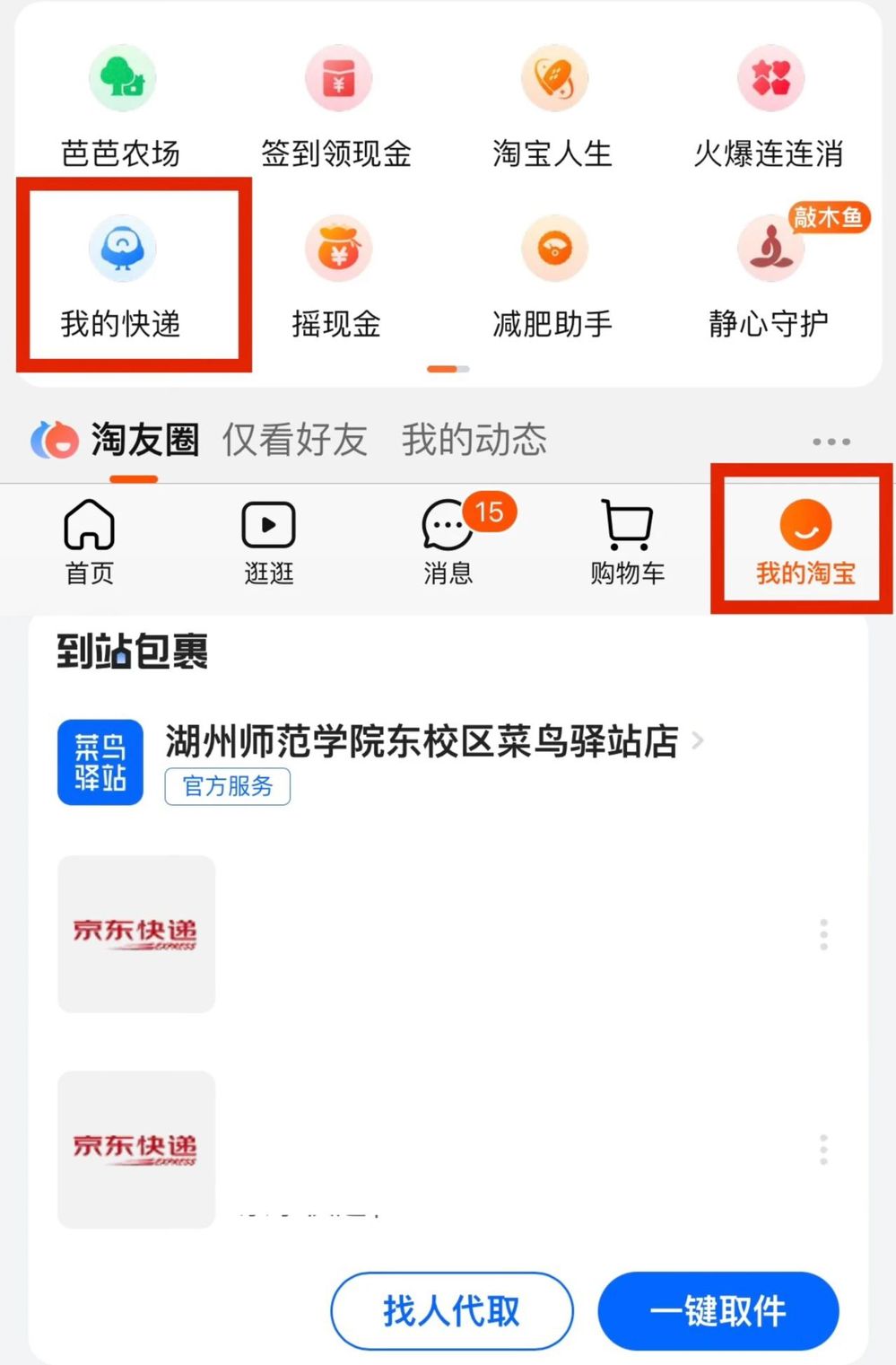 新生可下载“菜鸟”App进行身份绑定后,或者通过打开“淘宝”App>我的淘宝>我的快递,查看到站包裹信息,凭身份码取件。