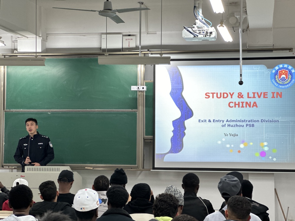 On October 29th, Officer Ye from the Exit Entry Management Bureau of Huzhou Public Security Bureau gave a special introductory education lecture on exit entry policies to more than 100 international freshmen from over 30 countries.