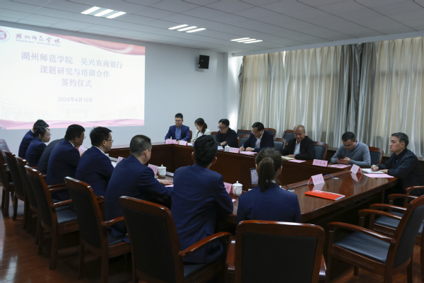 4月10日下午,学院与吴兴农商银行举行课题研究与培训合作签约仪式。校党委副书记陈永华,吴兴农商银行党委书记、董事长陈法良,行长戴益众、副行长朱子平、卢启祥;我院院长周建华、副院长马小龙出席。吴兴农商银行相关职能部门负责人、学院课题组成员等参加签约仪式。