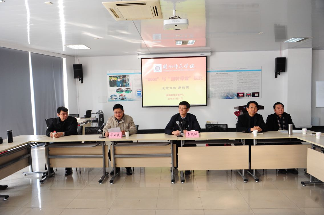 为推进我校课堂教学创新,构建高效课堂,1月21日上午,校教师教学发展中心邀请中国计算机学会副理事长、教育部高等学校计算机教学指导委员会副主任委员、北京大学校长助理、博士生导师李晓明教授,来我校和老师们进行了“MOOC”与“翻转课堂”探究的研讨。本次研讨会由副校长蒋云良主持,信息工程学院、工学院、理学院、社会发展与管理学院等8个学院近50位教师参加了研讨会。