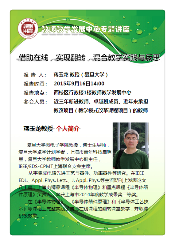 报名形式:本次讲座为“2015年新入职教师教学技能培训”项目之一,2015年新进专任教师、辅导员、教辅人员无须报名,务必到场参加。其他要参加的老师于9月15日12:00前点击相关链接进行报名,活动前一天您将收到教师教学发展中心的短信提醒。
