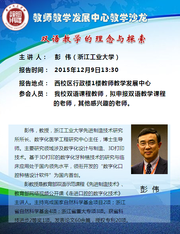 报名形式:本次活动可容纳70人参加,按报名顺序先到先得,感兴趣的老师务必于12月8日17:00前点击相关链接进行报名,活动前一天您将收到教师教学发展中心的短信提醒。 学时管理:请参会人员提前10分钟到场签到,本次培训计4学时。 联系人:欧雯雯(2321995,667772)
