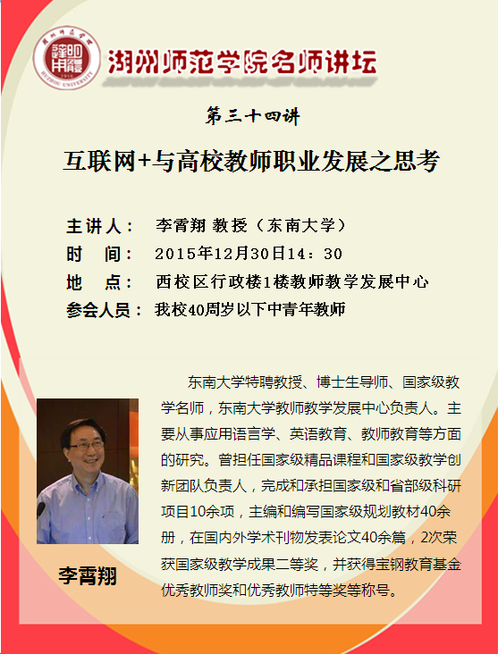 • 【名师讲坛】第三十四讲:互联网+与高校教师职业发展之思考――李霄翔
