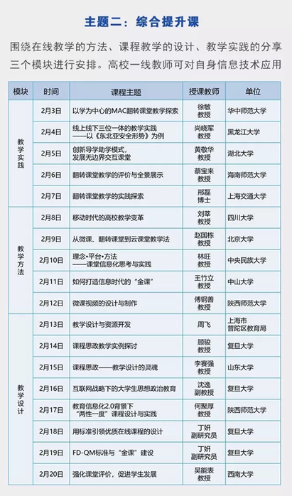 为贯彻落实上级教育主管部门及学校疫情防控工作的相关精神,加快开展“互联网+教学”工作,推行远程教学模式,落实“停课不停教、放假不放学”的要求,帮助广大教师尽快掌握“互联网+教学”基本技能和要求,推动信息技术与教育教学的融合,我中心依托超星教师发展中心平台,组织开展“停课不停学”信息化教学能力提升培训活动。通过超星“学习通”APP为广大教师提供线上课程或专家直播课程(本校教师首次登录的初始账号及密码为“工号+123456”),所有课程均为公益性优质网络学习资源。课程将围绕提升信息技术应用能力展开,分为技术先导课、综合提升课、重点突破课、示范指导课四大主题,采取“线上课程+专家直播”的模式开展。每个主题模块课程结束前,将在“超星教师发展中心(chaoxingjiaofa)”公众号发布下一主题课表,请各位教师及时关注课表信息。