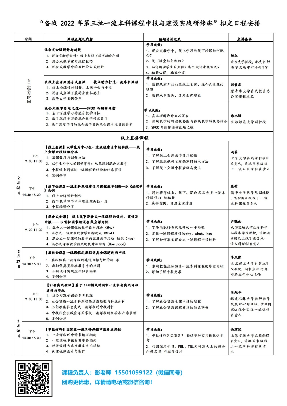 为深入贯彻落实全国教育大会和新时代全国高等学校本科教育工作会议精神,落实教育部发布《关于一流本科课程建设的实施意见》文件要求,推动新工科、新医科、新农科、新文科建设,加快建设与新时代优米app官方下载入口手机版需求相适应、与新技术相融合、与教育教学方式方法改革相配套的教育教学管理机制,助力全国高校探索线上线下混合式教学模式,积极建设申报一流本科课程,提前备战第三批一流本科课程申报工作,高教国培将举办“备战2022 年第三批一流本科课程申报与建设实战研修班”。