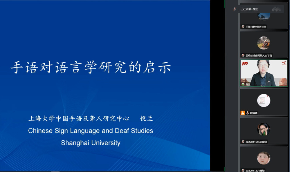 10月14日下午,上海大学倪兰教授应邀为人文学院师生带来题为《手语对语言学的启示》的线上学术报告。“王刚名师工作室”全体成员聆听了本次报告。
