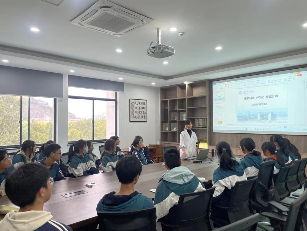 杨洁对沈慧峰一行表示热烈欢迎,并陪同参观了学校党建中心。张立钦名师工作室相关老师带领学生参观了浙江省媒介生物学与病原控制重点实验室。生物系主任吴小映作了关于大生物学科发展前沿的报告。学生在生物学科老师指导下,近距离观察和感受高校科研工作的开展。座谈中,两校老师就师范生合作培养、教师教学科研等合作意向进行了深入探讨。