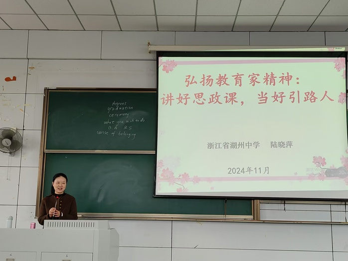 为贯彻落实教育家精神,提升马克思主义学院师范生技能和水平,11月18日上午,湖州中学陆晓萍老师应邀为我院学生开展“弘扬教育家精神:讲好思政课,当好引路人”专题讲座。我院100余名学生聆听了报告。