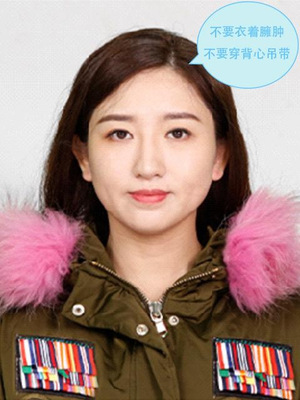 3、露出耳朵和额头,头部正视镜头,保持肩膀齐平,表情自然,嘴唇自然闭合;