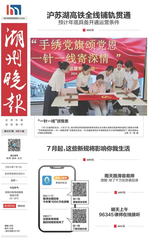 2024年7月1日,《湖州晚报》报道我院党总支与湖州市南太湖新区杨家埠街道党工委联合开展“手绣党旗颂党恩,一针一线寄深情 ”主题党日活动。链接如下: