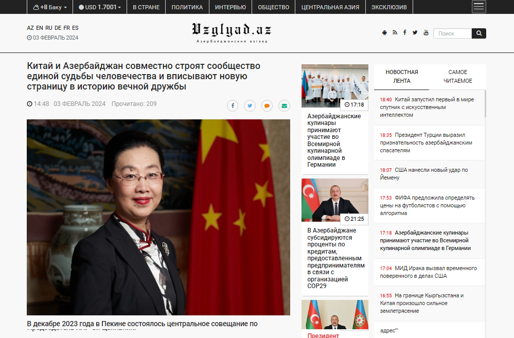 2月3日,驻阿塞拜疆大使郭敏在阿塞拜疆总统事务管理局直属官媒《巴库工人报》发表署名文章《携手构建人类命运共同体 共同谱写中阿友好新篇章》,宣介中央外事工作会议精神和构建人类命运共同体理念。“观点”新闻网、巴库论坛网等主流媒体予以转载。文章全文如下:
