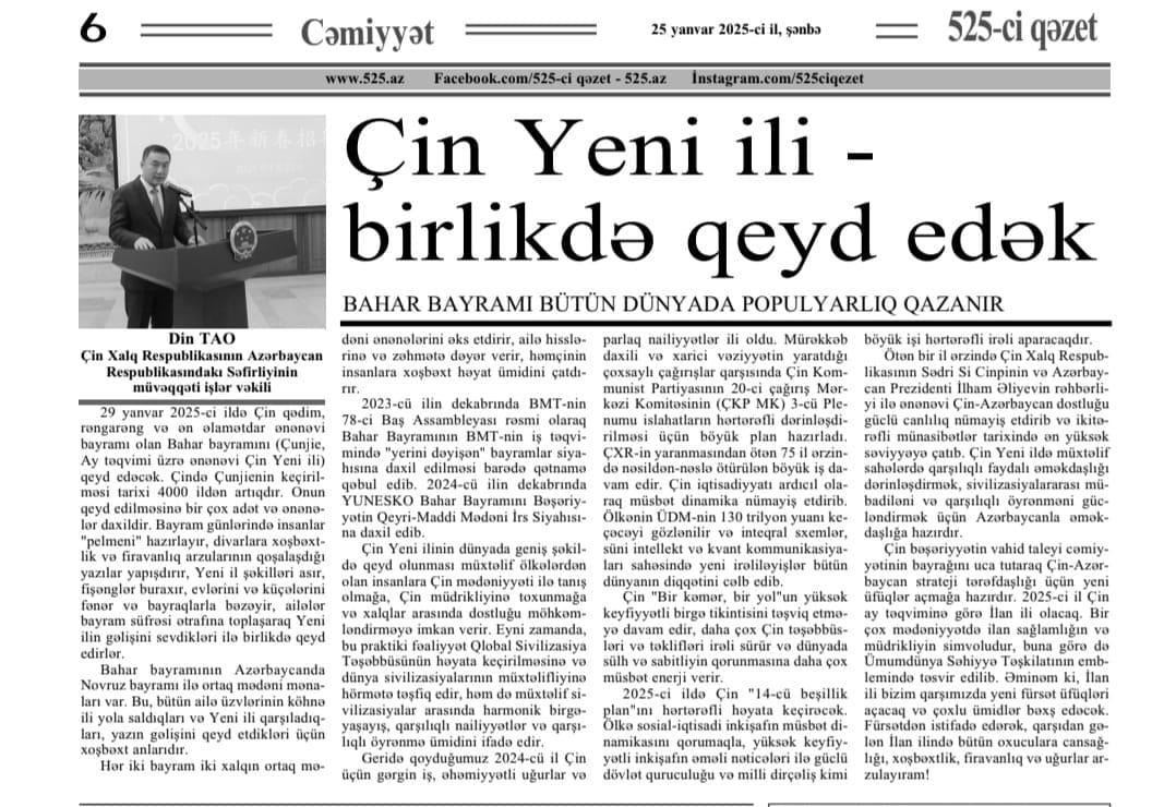 1月25日,驻阿塞拜疆使馆临时代办丁涛在阿主流媒体《525报》发表署名文章《“中国年·在一起”——中国春节不断走向世界》,深入宣介春节文化内涵和世界意义。