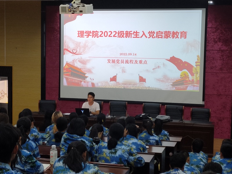 9月14日下午,我院于理学之光报告厅室开展2022级新生入党启蒙教育,辅导员刁韩杰主讲,他从“什么是中国共产党、为什么要加入中国共产党、加入中国共产党需要做什么”三个方面对新生进行了讲解。鼓励同学们要树立共产主义远大理想,坚定中国特色社会主义信念。通过对马克思主义理论、习近平新时代中国特色社会主义思想、党的路线方针政策等理论知识的学习,不断深化对党的认识。希望同学们大学期间严格要求自己,踊跃递交入党申请书,尽快从思想上、行动上向党组织靠拢,争取早日成为一名光荣的中国共产党党员。