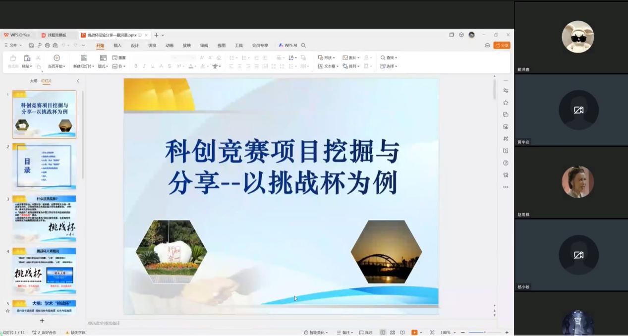 活动伊始,我院戴洪嘉同学从“什么是挑战杯”、“怎么参加挑战杯”等方面向同学们详细介绍了挑战杯的有关信息,为线上的同学们了解挑战杯提供细致的帮助。紧接着,我院黄宇安同学继续补充,以具体形象的该赛事的获奖作品和有关获奖作品的主题和内涵为同学们展现了挑战杯的高价值性、高贴合社会性,从作品包含什么内容、作品怎么评审、如何参与项目后有效获取成果等角度,结合个人的经历以及团队遇到的常见困难,总结成经验并分享给线上各位。经验分享会中,大家对创新创业在生活学习中的重要性有了充分的认识。而在参与项目中,坚持,保持责任感,正确对待团队成员之间的差异并合理定位成员的工作,让团队成员发挥最大的作用让在场各位收获颇丰。两位同学的分享让聆听的同学们对创新创业各类比赛产生了浓厚的兴趣,激发了同学们的参赛热情。